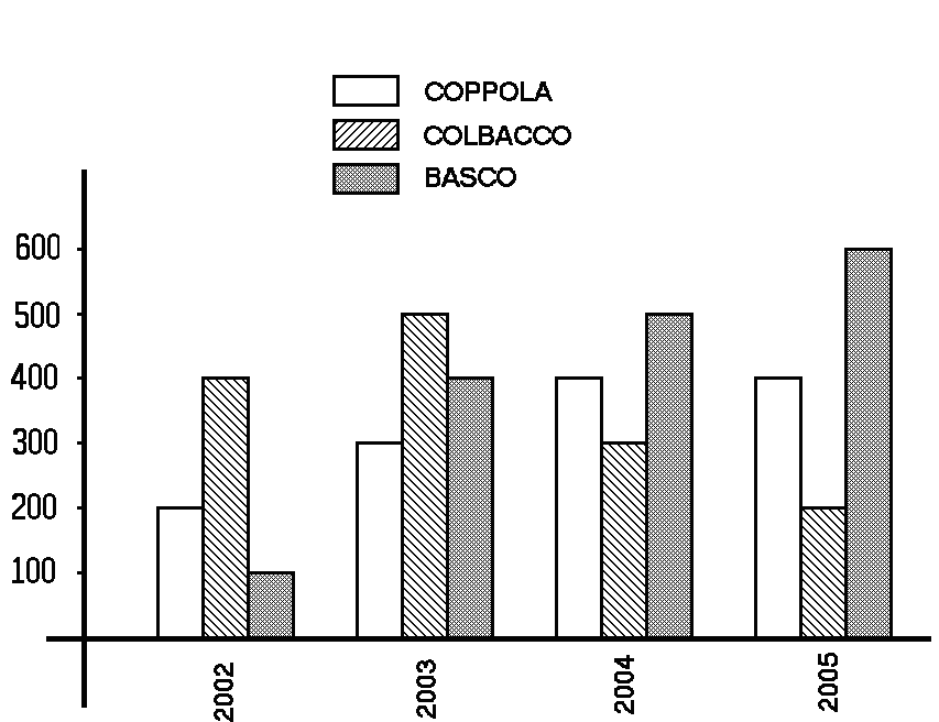 Nel grafico è rappresentata la vendita di una cappelleria in quattro diversi anni. Quale tra i tre copricapi ha avuto la vendita media più alta? |